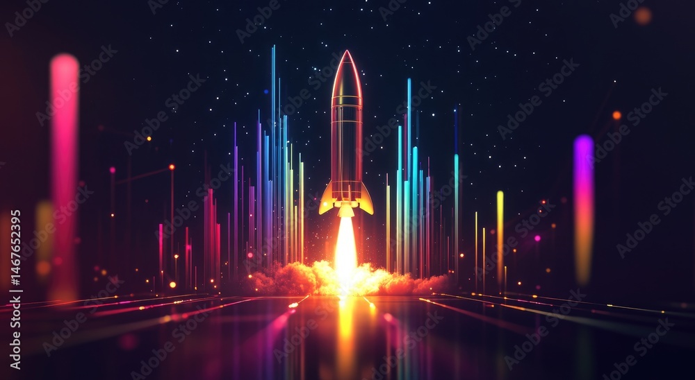 Rocket launch into vibrant digital space. Abstract design with a rocket taking off, surrounded by colorful lines and particles, representing growth and innovation #1467652395
