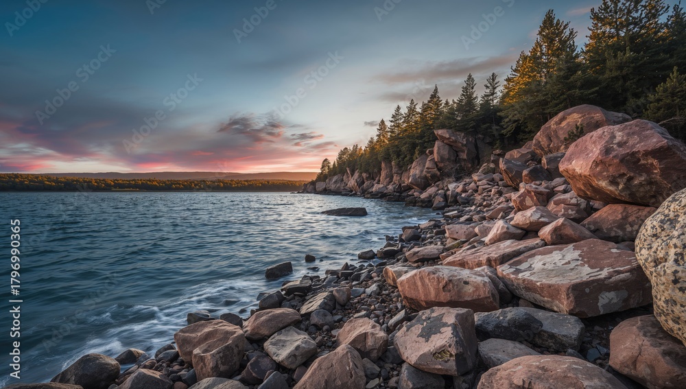 Rocky coastline with water and sky, summer travel destination, erosion risk #1796990365