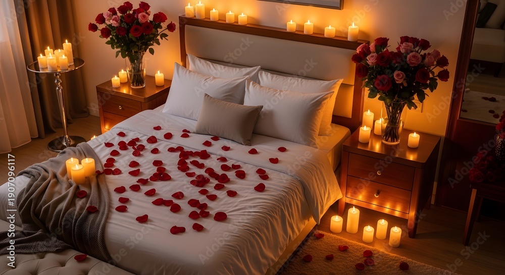 Romantic Bedroom Decorated with Roses and Candles for a Special Night #1907096117