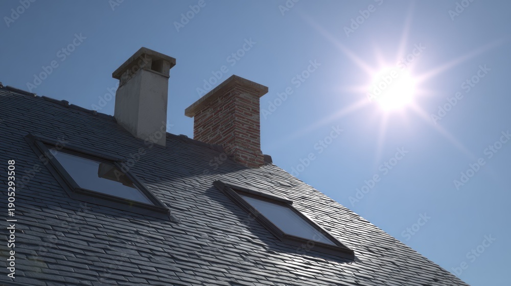 Roof with chimneys and skylights under bright sunlight and clear sky #1905293508