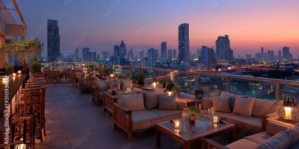 Rooftop cafe overlooking modern skyline at dusk, romantic and warm atmosphere. #1931093668