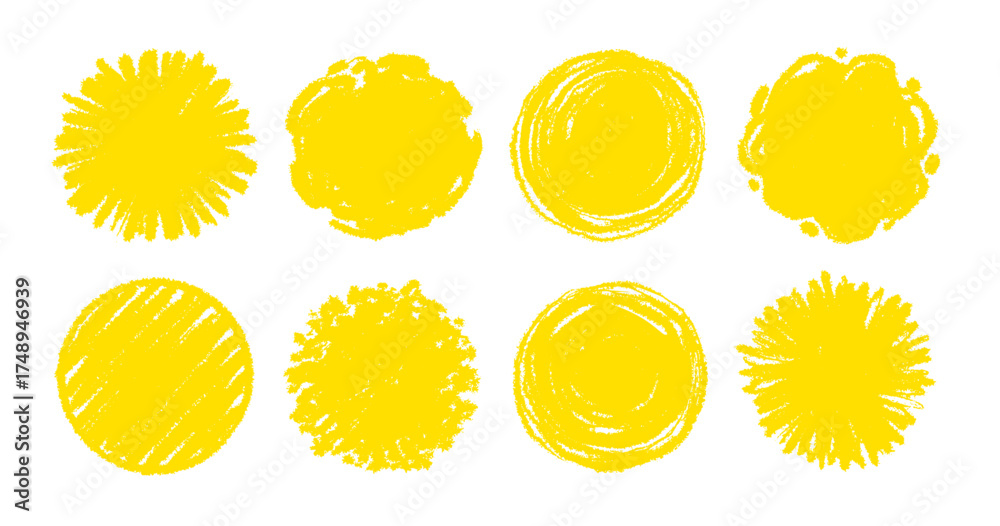 Round sun watercolor paint shape sets. Hand drawn rough yellow circle shape ink brush stroke grunge texture. Grunge circular rough brush badge background Japanese sun elements. Vector illustration #1748946939