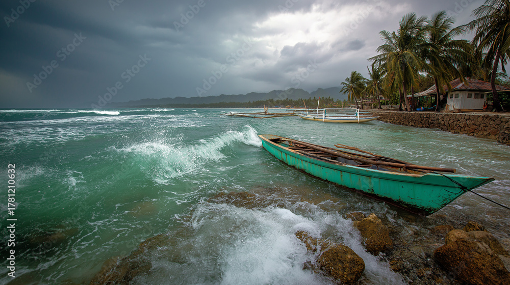 row boat on pebble beach , storm strike on Philippines beach shore #1781210632