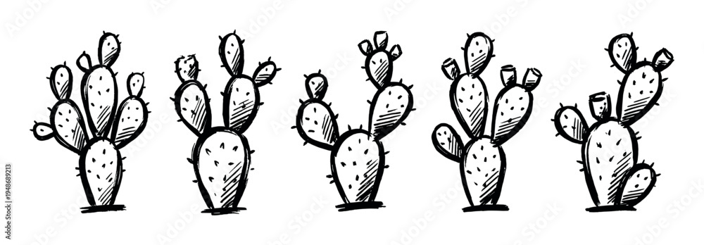 Row of five hand-drawn prickly pear cacti illustrations, showcasing their distinctive paddle-shaped pads and spiky texture in a sketch style. #1948689213