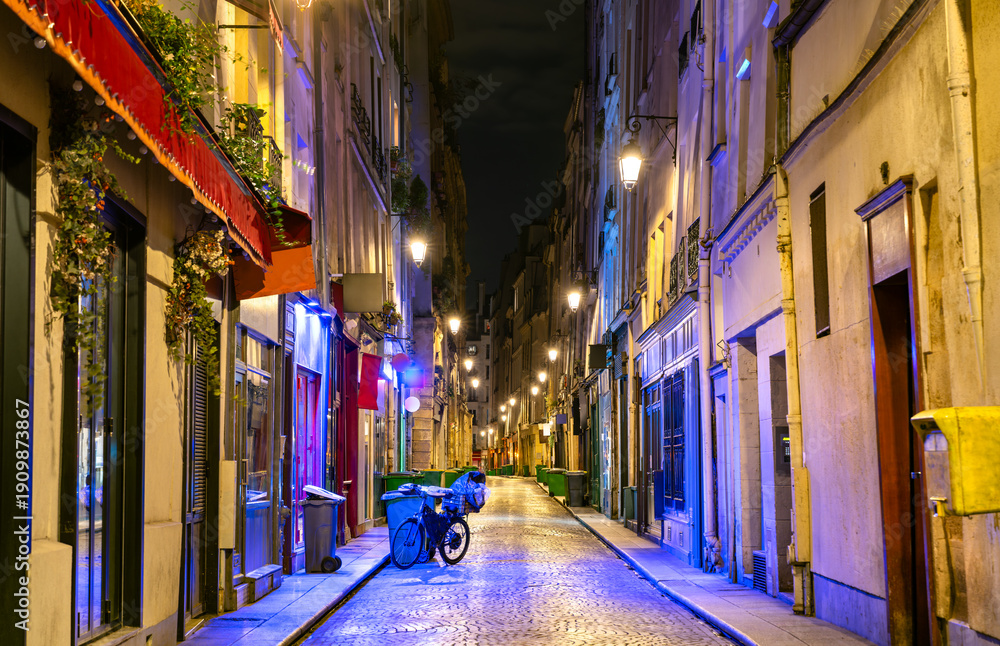 Rue Saint-Sauveur in the 2nd district of Paris France. Historic narrow cobblestone street features illuminated shops and cafes at night #1909873867