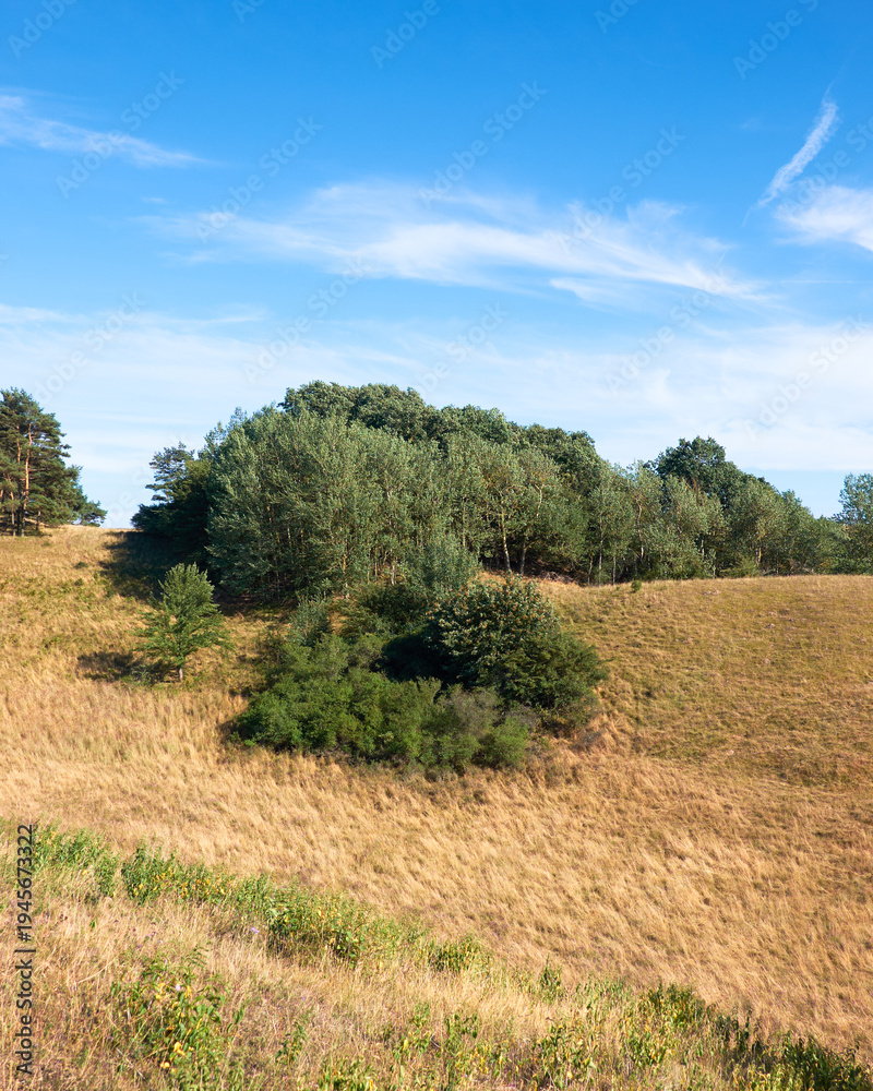 Rugen landscape with grassy dunes and coastal trees under clear blue sky #1945673322