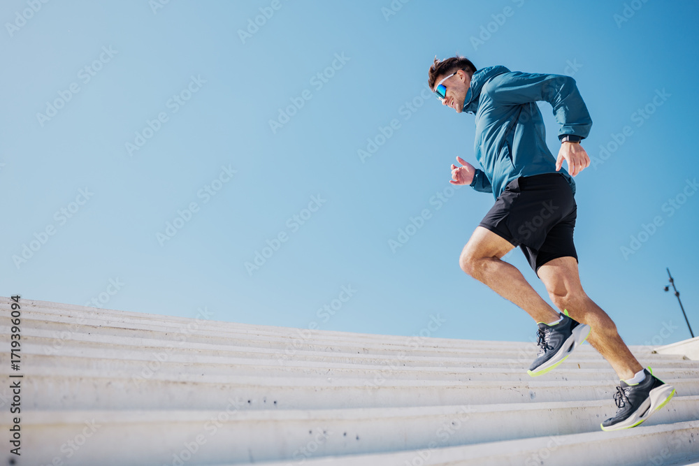 Runner ascends outdoor steps in athletic gear during fitness routine #1719396094