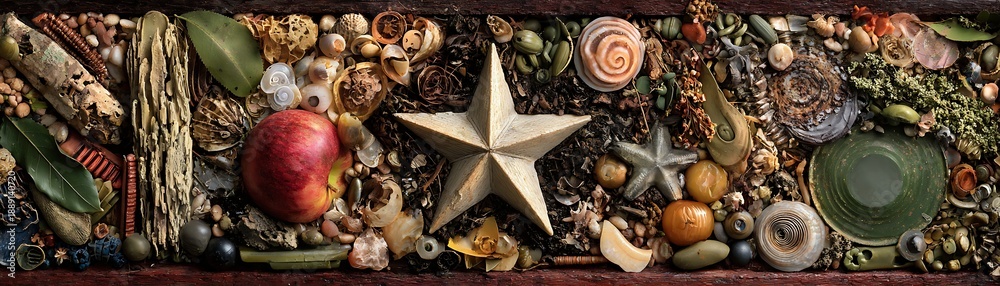 Rustic arrangement of natural elements and decorative objects in a shallow container #1889140720