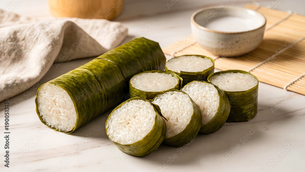 Rustic display of traditional lemang served on a wooden plate. This iconic food highlights the rich rice culture of Indonesia, ideal for travel and lifestyle editorial content. #1900513134