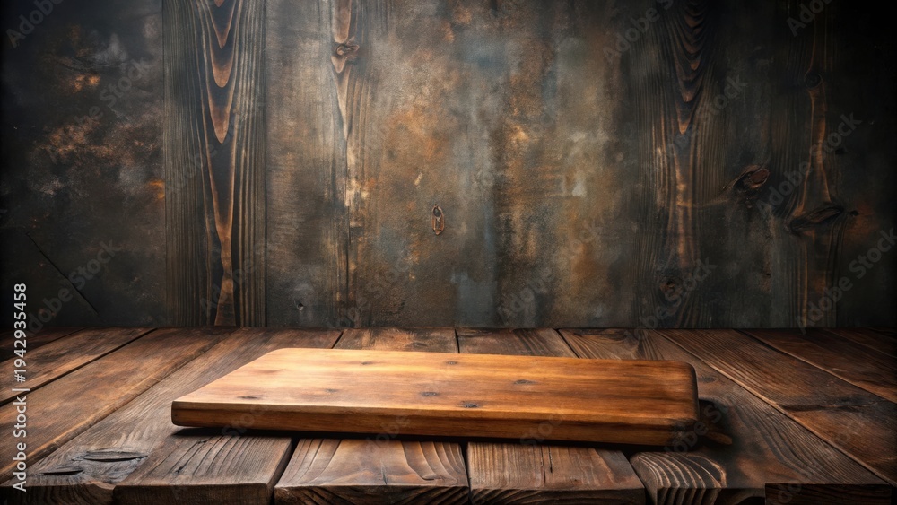 Rustic Wooden Tabletop with Aged Wooden Cutting Board Displaying Empty Space for Culinary or Product Presentation #1942935458