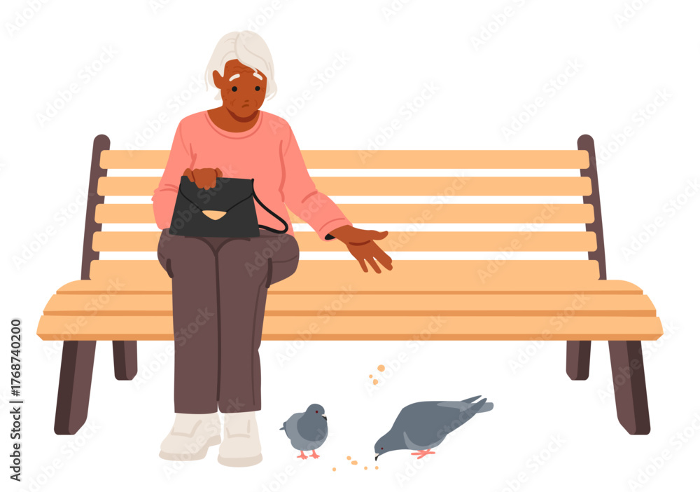 Sad retired woman cartoon character sitting on bench feeding pigeon birds feeling loneliness #1768740200
