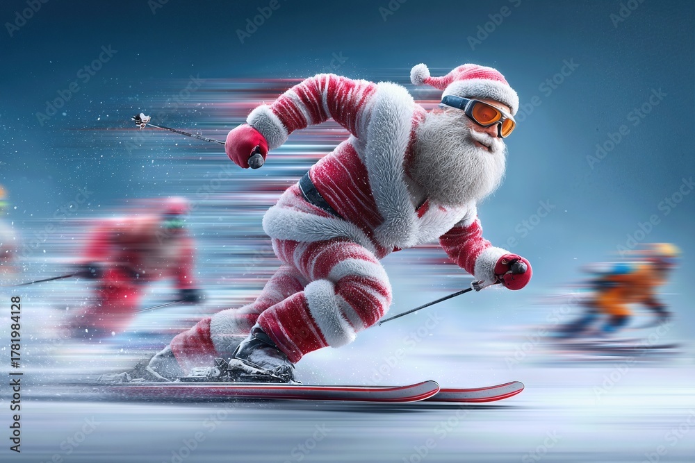 Santa Claus ski race in motion on a snowy slope with speed blur and competing skiers #1781984128