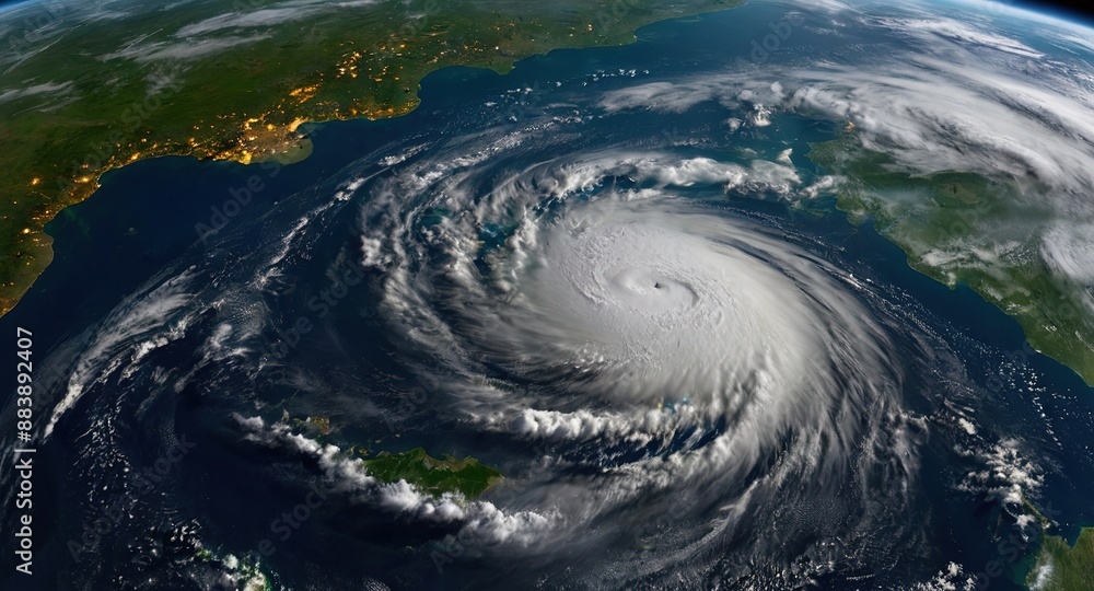 satellite view of a massive hurricane over earth's atmosphere background photo #883892407