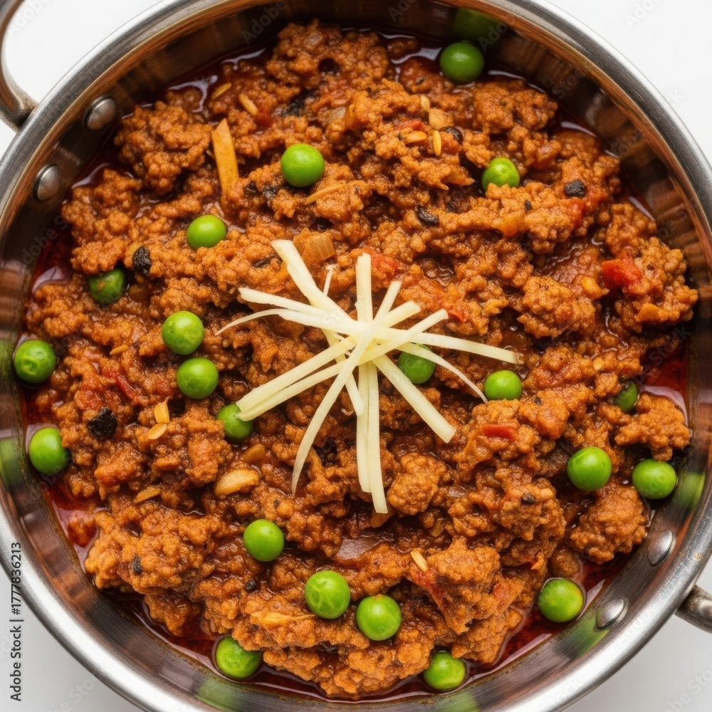 Savory keema matar indian ground meat and pea curry dish isolated on white background #1777836213