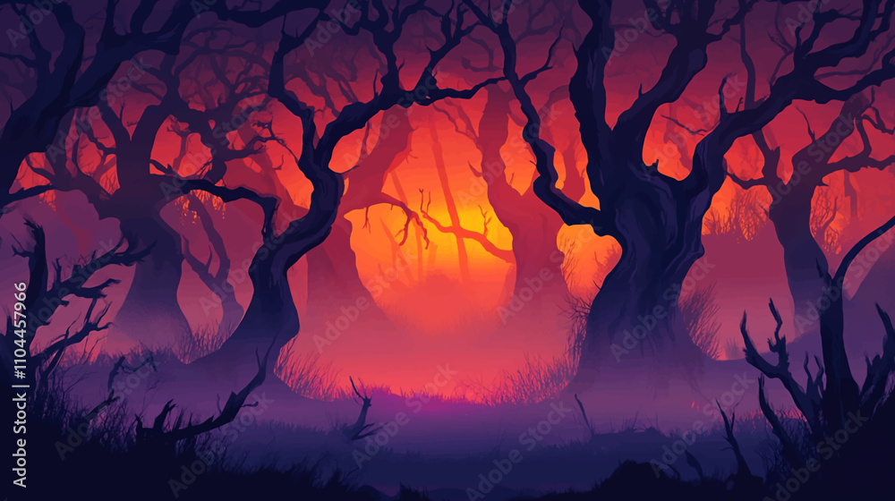 Scary dark forest at night. Halloween background with spooky woods. Vector cartoon illustration of creepy deep forest landscape with tree trunks, grass and stones #1104457966