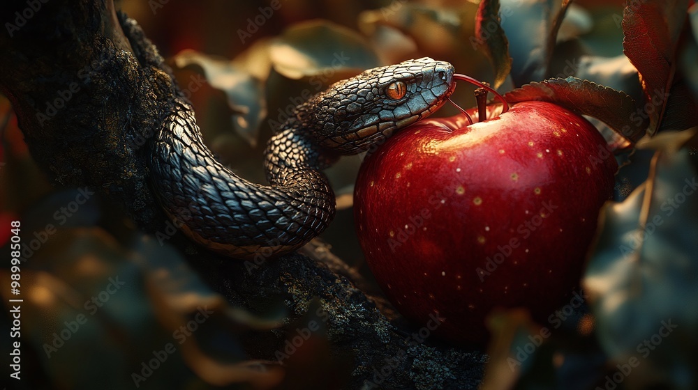 scene of a snake in an apple tree next to a red apple depicting original sin and temptation symbolizing the biblical narrative of the garden of eden and the serpent's role in the fall of man #989985048