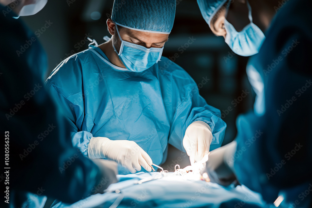 Scene of a surgeon performing open-heart surgery, showing the details of the procedure. #1080556353