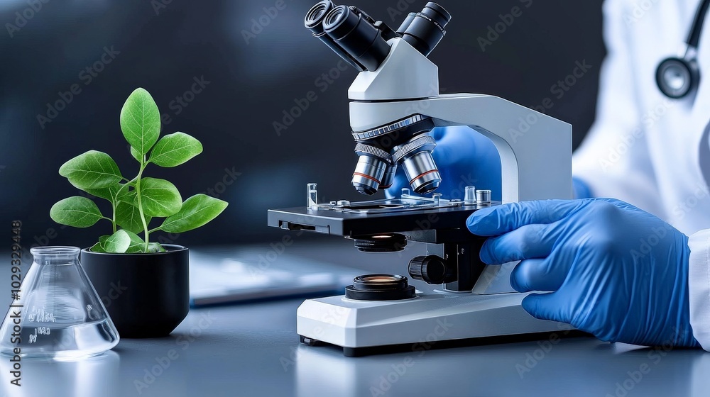 Scientific Discovery: A scientist meticulously examines a plant sample under a microscope, revealing the intricate details of nature's wonders. #1029329448
