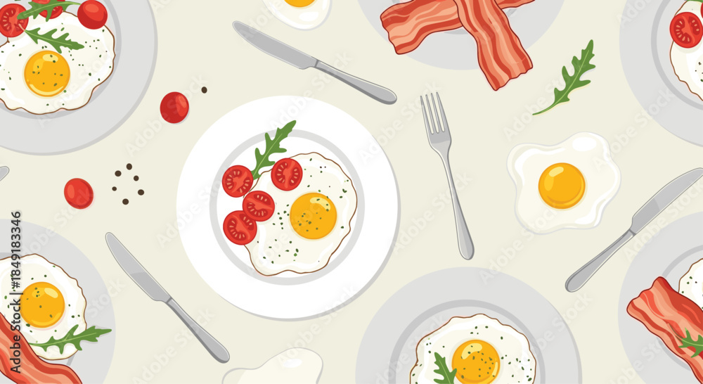Seamless pattern background of a classic breakfast with fried eggs on plates bacon strips cherry tomatoes and cutlery for a cafe. #1849183346