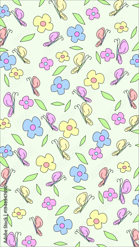 Seamless Pattern with Cute Hand-Drawn Butterflies and Colorful Flowers #1946547690