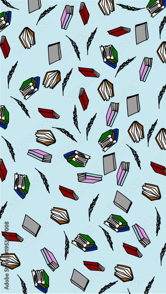 Seamless Pattern with Flying Books and Quill Feathers on Light Blue Background #1953027008