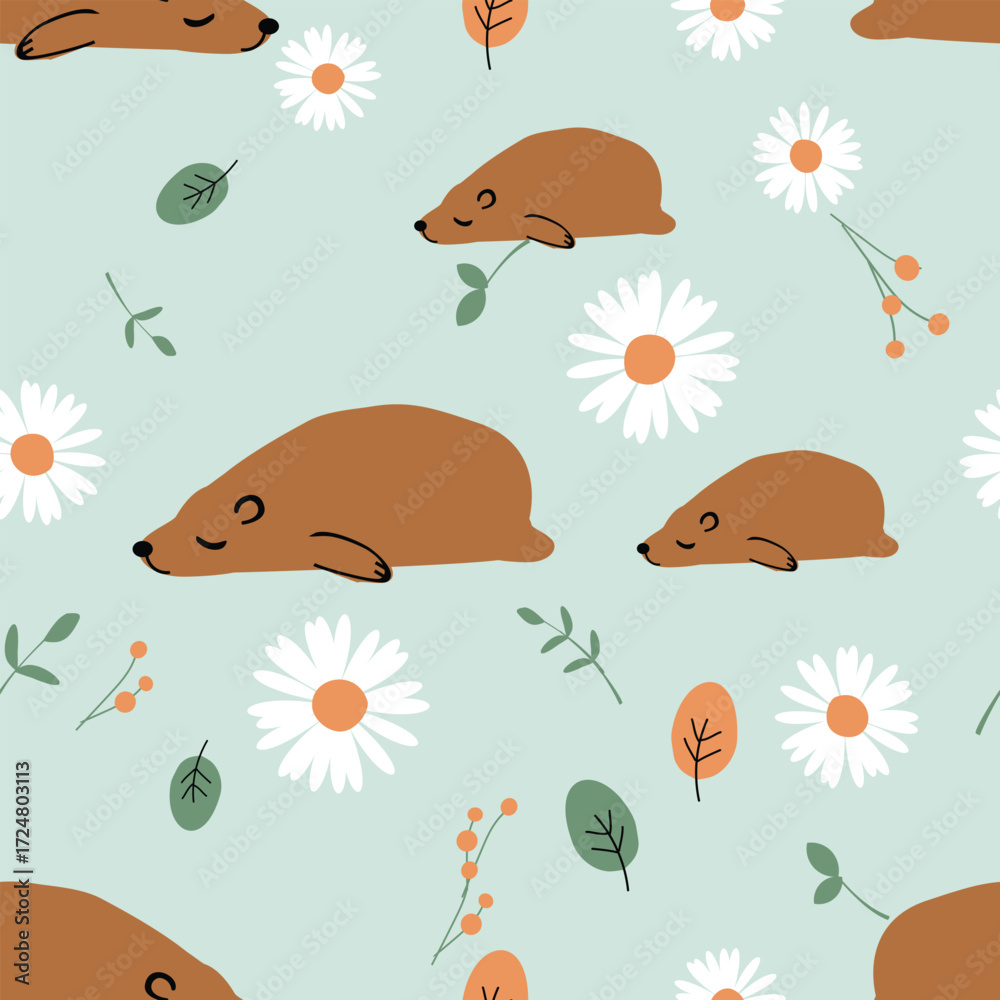 Seamless pattern with sleeping bear cartoons, daisy flower, berry branches and falling leaves on green background vector. #1724803113