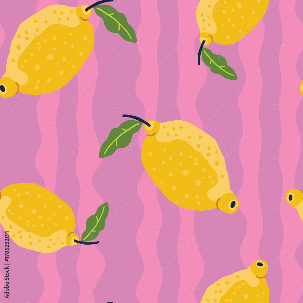 Seamless pattern with yellow lemons on a pink background. Summer repeating pattern, packaging design. Flat vector illustration. #1785232191