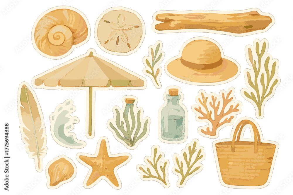 Seaside Watercolor Stickers. Seaside midsummer escape. Realistic hand-painted watercolor style sticker sheet #1775694388