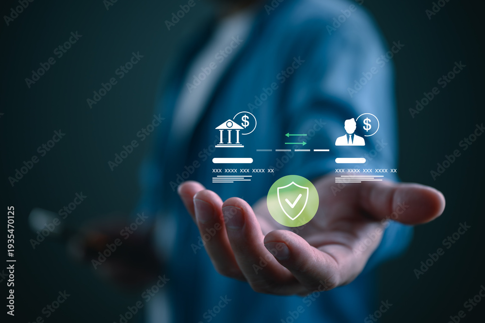 Secure digital payment, bank transfer. financial transaction interface with bank, user, and shield protection icon, symbolizing fintech security, safe online banking, trusted money exchange. #1935470125