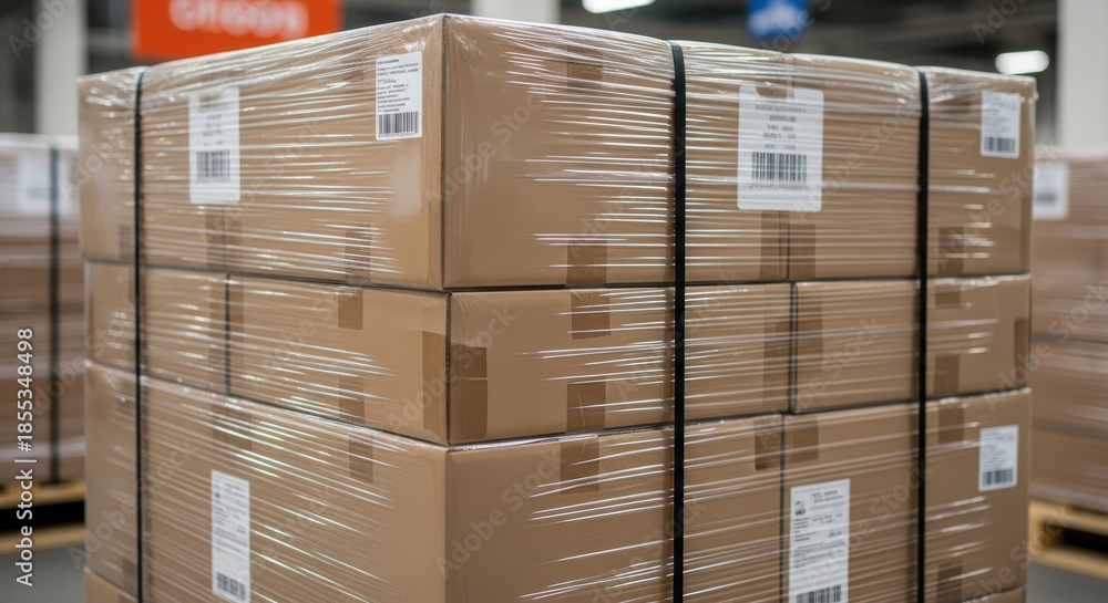 Securely wrapped cardboard shipping boxes stacked on pallet with plastic film in warehouse distribution center ready for logistics transport and delivery fulfillment #1855348498