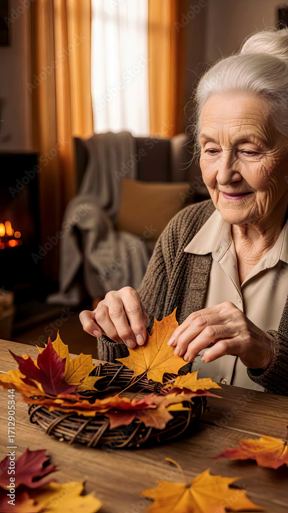 senior Caucasian woman arranging autumn leaves into a decorative wreath #1712905344