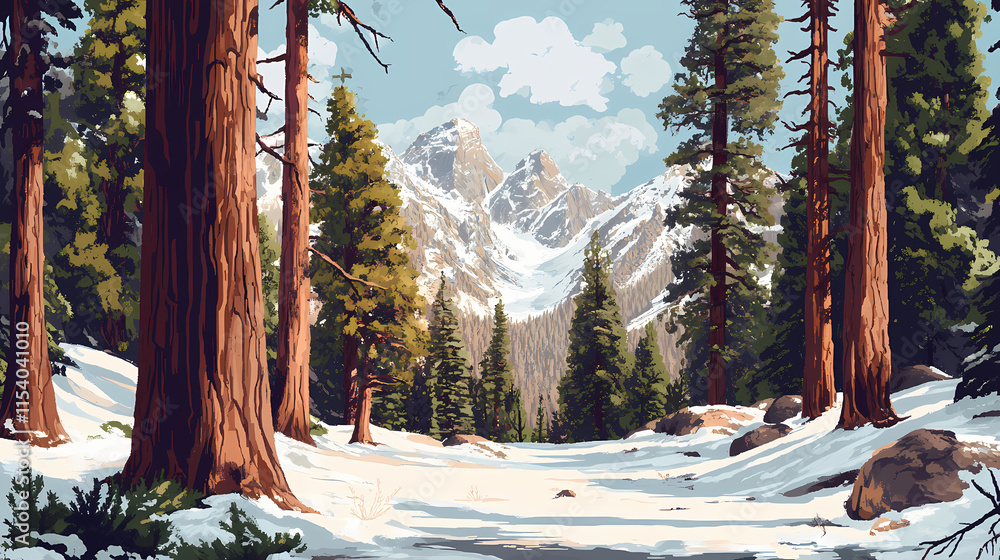 Sequoia national park in the southern sierra nevada. poster from a series of usa national parks. hand-painted panoramic background. Sequoia. Illustration #1154041010