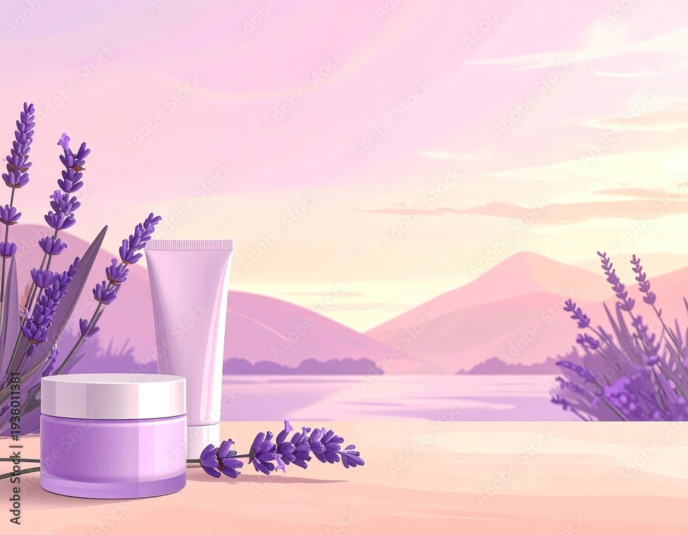 Serene scene Lavender plants frame skincare products against a soft pastel mountain vista #1938011381