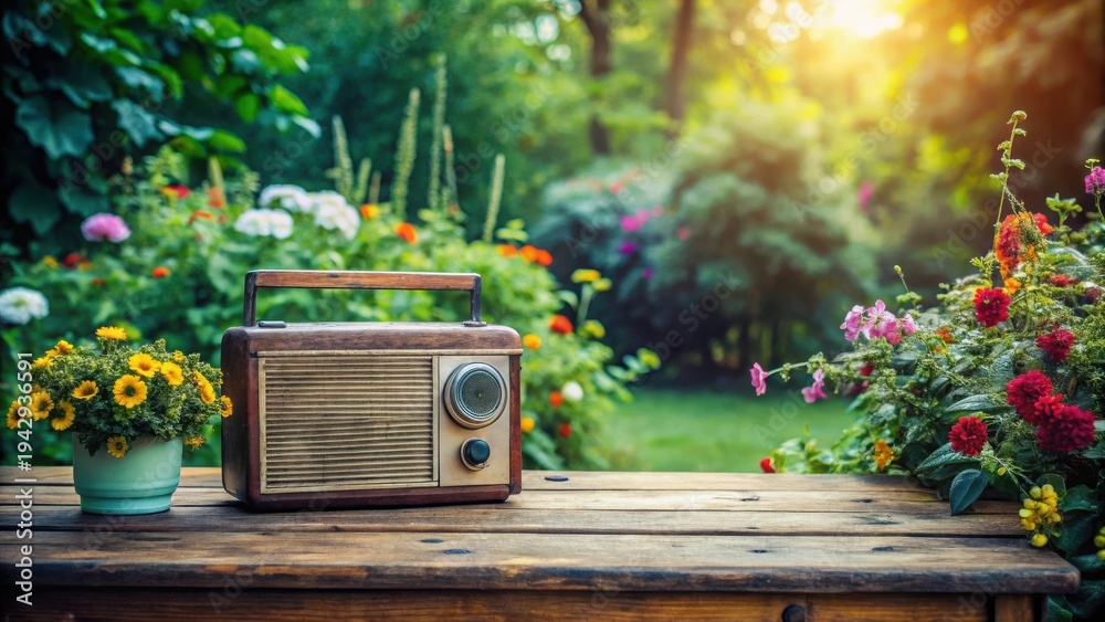 Serene Summer Vintage Radio and Blooming Flowers on Rustic Wooden Table in a Lush Garden #1942936591
