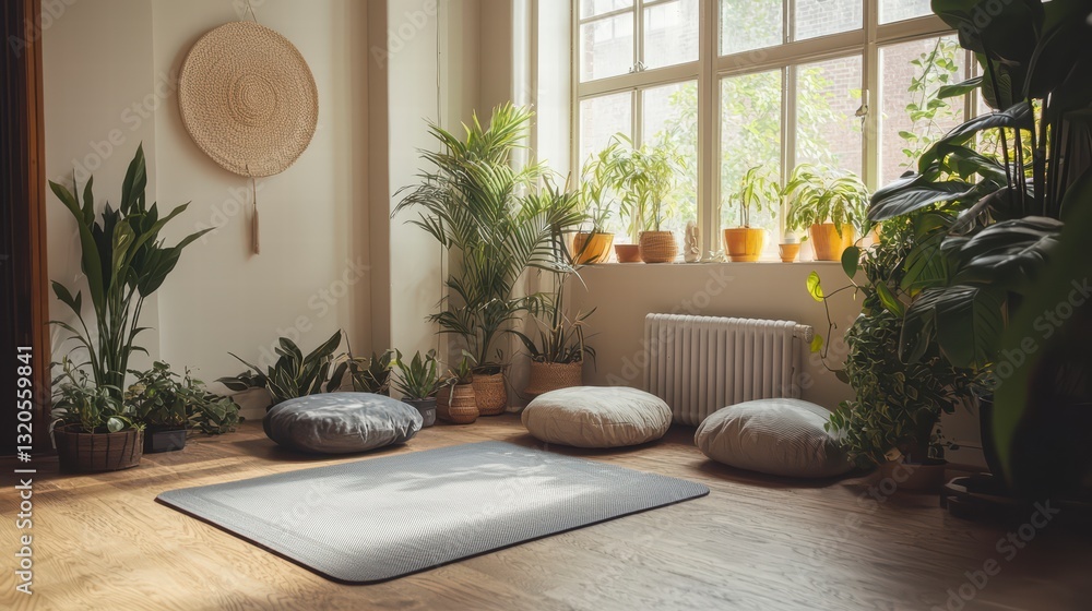 Serene Yoga Studio: A tranquil yoga studio bathed in natural light, featuring a variety of potted plants, comfortable floor cushions, and a peaceful atmosphere. #1320559841