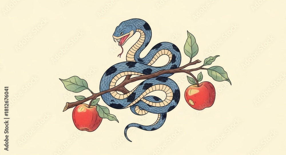 Serpent on an apple tree branch with red apples. Biblical temptation concept from the Garden of Eden story. Christian religion graphic. #1812676041