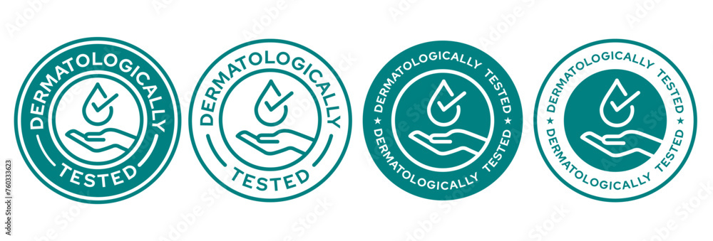 Set dermatologically tested vector label with water drop, leaf and hand logo. Dermatology test and dermatologist clinically proven icon for allergy free and healthy safe product package tag. #760333623