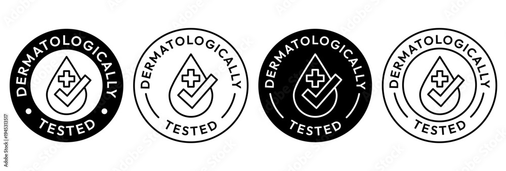Set dermatologically tested with water drop, tick, mark, hand, icon, label, logo, badge, line, vector, isolated. Dermatology test, dermatologist, clinically proven, sensitive skin, skincare symbols. #1945313517