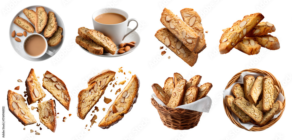 Set of Biscotti cantucci, classic Italian almond nut crunchy twice-baked cookie biscuit, pile stack bitten broken, basket, chai tea pairing, transparent cutout PNG. Many different Mockup template #1764146802
