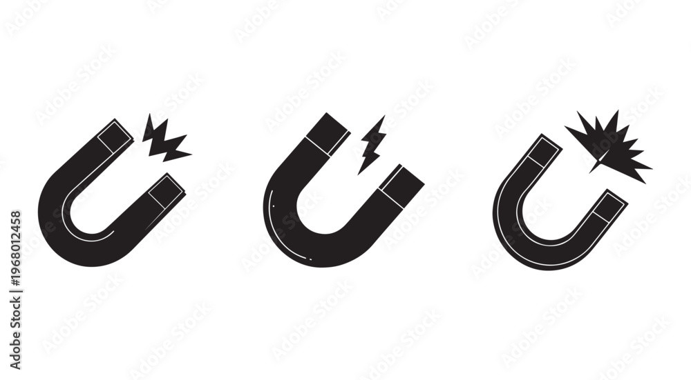 Set of black and white illustrations of magnets with lightning sparks magnetic field and attraction forces physical phenomenon educational material science concepts #1968012458