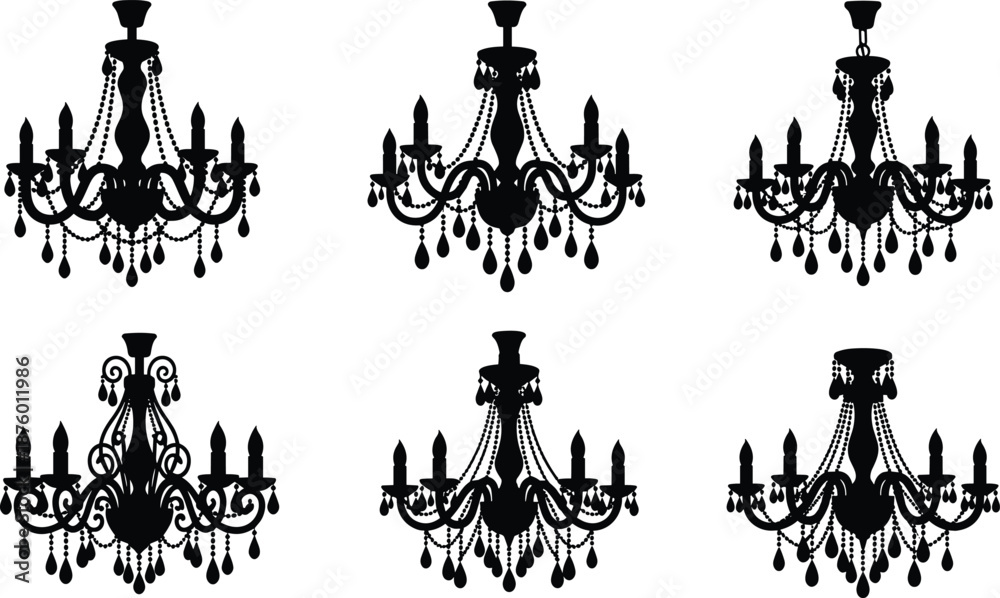 Set of black chandelier silhouettes featuring vintage crystal lamps, luxury ceiling light fixtures, and ornate baroque candelabra icons for classic interior design. #1876011986
