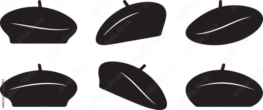 Set of black french beret hat silhouette vector flat illustration design. black art icon drawing vector #1936049872