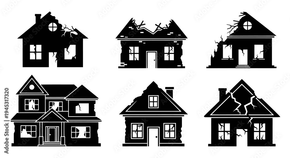 Set of Black Silhouettes of Damaged Houses, Destroyed Buildings #1945317320