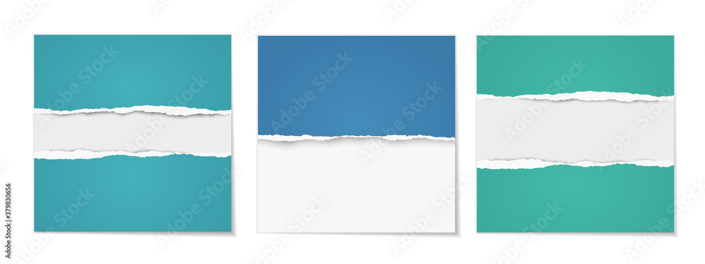 Set of brochure, flyer templates. Torn blue, green paper for posters, advertisement. Vector illustration #379830656