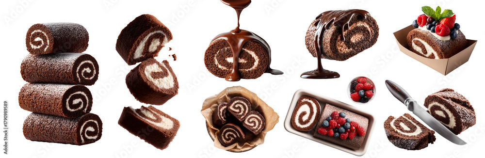 Set of chocolate swiss roll jelly roulade roll-up sponge cake with choco jam cream icing fillings dipping, knife slice pile, berries, takeaway package, transparent cutout PNG. Many different Mockup #1790989589