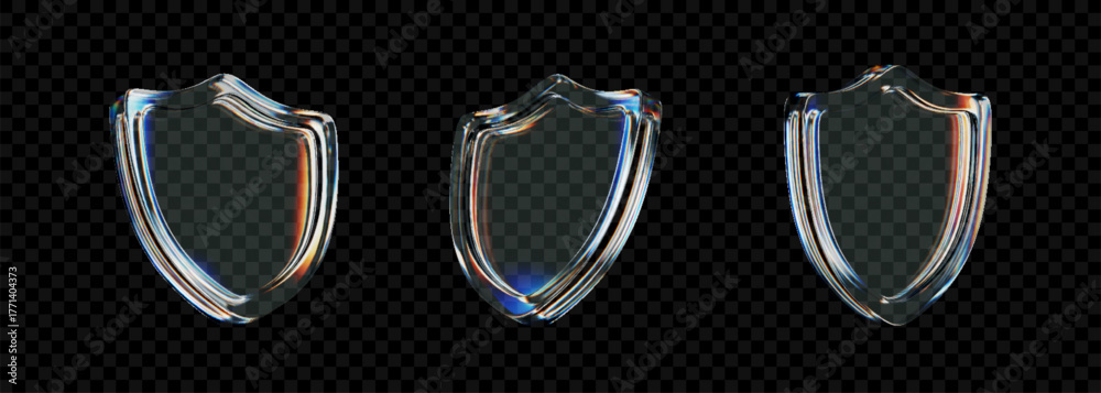 Set of 3D transparent glass shield icon with holographic gradient and light refraction effects on a dark background. Modern security, privacy protection, and data defense symbol. #1771404373