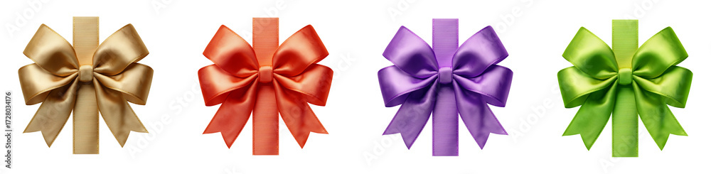 Set of decorative ribbon bows in gold, red, purple, and green with transparent background for gift wrapping and design #1728034176
