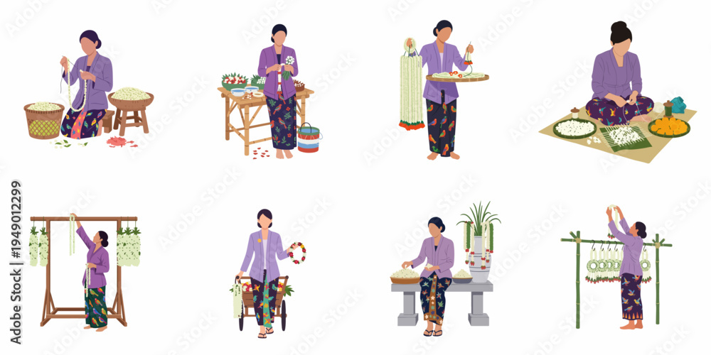 Set of flat illustrations featuring traditional Javanese women crafting and selling jasmine flower garlands in various poses and settings. #1949012299
