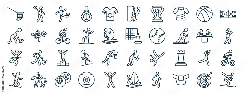 set of 40 flat sports web icons in line style such as american football player playing throwing the ball in his hand, american football player, marathon champion, stick figure on snowboard, board #473440305