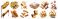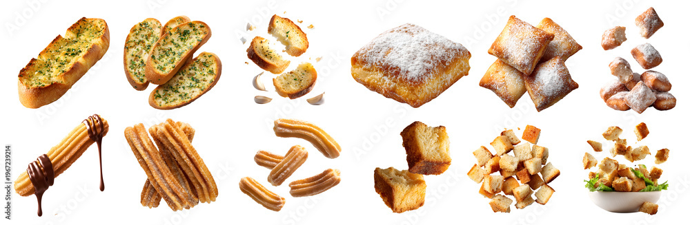 Set of 4 fried baked bread bun, Croutons, Churro fritters, Beignet donuts doughnut, Garlic butter herb bread, stack pile slice broken, transparent cutout PNG. Many different mockup #1967239214